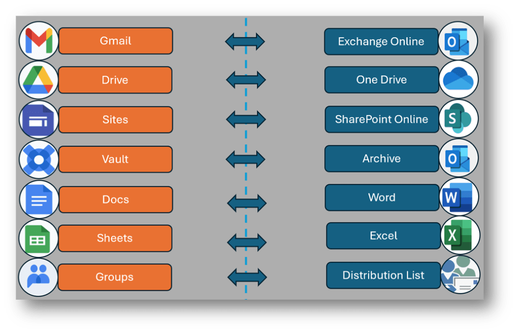In my previous blog, I explored the benefits of transitioning from Google Workspace to Microsoft 365, emphasizing advantages like enhanced growth potential, top notch security, great management tools, and access to desktop applications. As we now embark on our migration journey, it’s essential to first understand the service mapping between Google and Microsoft. This foundational step will pave the way for a smooth and efficient transition, ensuring our migration strategy is well-informed and effective.