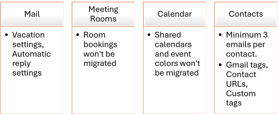 You can seamlessly transfer your emails, rules, calendar, and contacts from Google Workspace to Microsoft 365. Utilizing Microsoft’s native migration tool ensures a smooth transition, with the added benefit of comprehensive break-fix support from Microsoft in case any issues arise or other support options like FastTrack, Advisory etc.